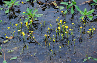 | Stems: | | Plants delicate, without roots, creeping in mud, at bottom of shallow water or on floating vegetation, or submersed, carnivorous. | | Leaves: | | Alternate, .12 to .6 inch, (thread-like) highly modified into finely dissected, branch-like segments bearing tiny ovoid or pear-shaped bladders that trap aquatic invertebrates, branches divided 1--3 times; bladders relatively few. | | Inflorescences: | | Racemes, terminal, 1-3(-8)-flowered; scapes .8 to 4 inches. | | Flowers: | | Pedicels .2 to .4 inch. Flowers: calyx 2-lipped, .06 to .12 inch, cleft to base, lobes entire; corolla yellow, sometimes drying pinkish, .2 to .4 inch, throat often closed by a conspicuous, rounded, often bearded palate of lower lip; lower lip entire or 3-lobed, upper lip entire or 2-lobed. | | Fruits: | | Capsules ovoid to globose, about .1 inch, subtended by persistent calyx; seeds brown or black, angular or ellipsoid. | | Habitat: | | Shallow water or mud along shores of marshes and small ponds. | | Distribution: | | Southeast quarter of Kansas | | Origin: | | Native | | Comments: | | The bladder-like traps of Utricularia are highly modified leaf divisions. The entrance to each trap is closed by two inward-opening flaps. When a trap is mechanically triggered by a small invertebrate, water suddenly rushes into the trap, carrying the animal with it. This movement is too rapid to be seen with the unaided eye. Digestion of the prey usually occurs in 48 hours or less. It is believed that digestion occurs via enzymes secreted by the plant, through bacterial action, or by a combination of the two. |