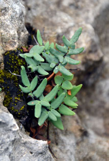 | Culms: | | Ascending to lax, usually branched, stout; scales reddish-brown, linear-subulate, to .24 inch long, thin. | | Leaves: | | Erect, numerous; petioles reddish brown to dark brown, mostly glabrous, shiny; blades 1-2 times compound, linear-oblong to linear-lanceolate in outline; pinnae bluish-green, leathery, pinnate or bipinnate, in up to 10 pairs, at acute angles to rachis; basal pinnae with 3-7 segments, sessile or short petiolate, upper pinnae simple, sessile, entire; pinnules narrowly lanceolate to oblong lanceolate, .1 to 1 inch long, .08 to .3 inch wide, mostly glabrous, often with 1-2 lobes at base, margins recurved, apex obtuse, veins usually obscure; sori in continuous marginal band, covered by recurved margins; sporangia with 32 or 64 tan spores. | | Habitat: | | Calcareous outcrops, ledges, and crevices | | Distribution: | | Principally east 1/2 of Kansas | | Origin: | | Native | | Comments: | | Pellaea, Greek "dark", perhaps alluding to the bluish-gray leaves.