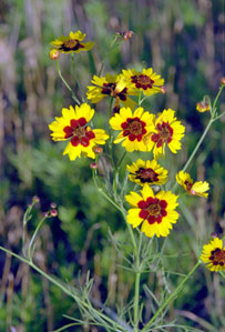 | Stems: | | Erect, single, much-branched above, glabrous. | | Leaves: | | Mostly opposite, nearly sessile or short-stalked, 2 to 4 inches long, 1-2 times pinnately divided; segments narrowly linear; upper leaves less divided. | | Inflorescences: | | Heads, numerous, terminal, .5 to 1.5 inch wide; bracts in 2 series, outer bracts 6-9, narrowly lanceolate to triangular, 1/2 as long as inner bracts | | Flowers: | | Ray florets 6-10, somewhat wedge-shaped, to 1/2 inch long, yellow with reddish brown spot at bases; tips prominently 3-lobed; disk florets numerous, corollas 4-lobed, purplish brown. | | Fruits: | | Achenes, linear, tiny, flattened, often wingless, black, usually without bristles or scales, enclosing small seed. | | Habitat: | | Damp disturbed sites, roadside ditches and low, sandy areas. | | Distribution: | | Throughout Kansas. | | Uses: | | Native Americans made a hot beverage from plains coreopsis, and early settlers placed plants in their mattresses because they believed they repelled fleas and bedbugs. | | Comments: | | Plains coreopsis is cultivated as an ornamental. |
